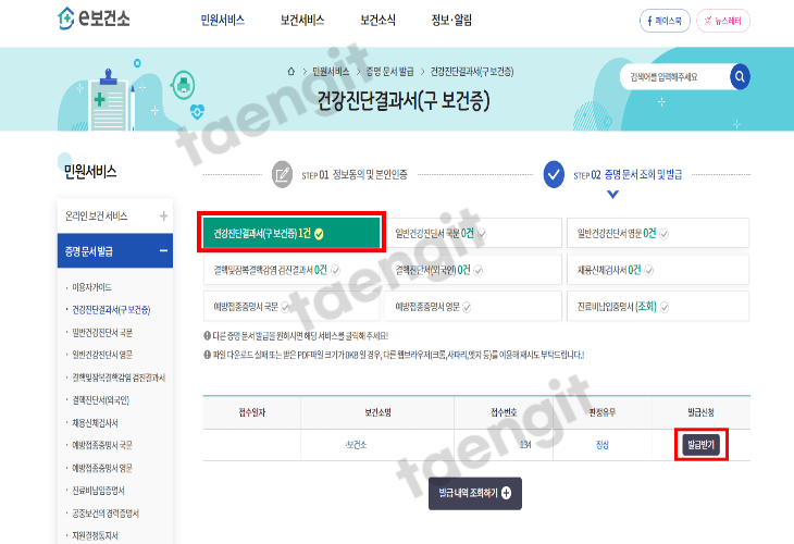 인증을 하였다면 건강진단결과서(구 보건증)에 1건이 표시되는 것을 확인할 수 있습니다. 이를 체크를 하면 내가 검사받았던 보건소명과 판정유무를 확인할 수 있습니다. 검사결과에 이상이 없다면 발급받기 버튼을 클릭합니다.